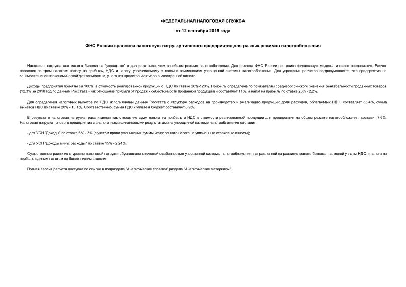Статус: Информационный документ Текст документа: присутствует в коммерческой версии NormaCS Утвержден: ФНС России; Федеральная налоговая служба, 12.09.2019 Обозначение: Информация Наименование: ФНС России сравнила налоговую нагрузку типового предприятия для разных режимов налогообложения Дополнительные сведения: доступны через сетевой клиент NormaCS. После установки нажмите на иконку рядом с названием документа для его открытия в NormaCS